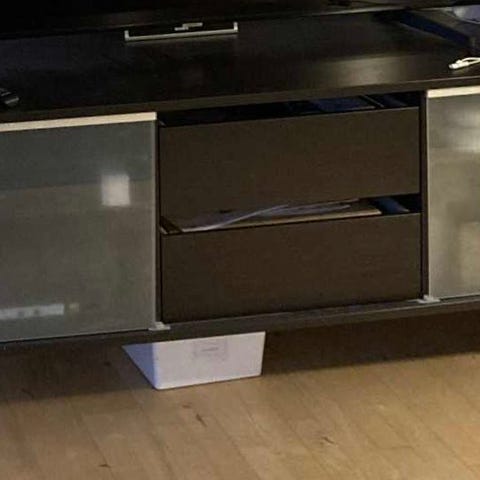 BYD : Hvidt TV møbel med skrå træben. Der er lavet hul i bagepladen til ledninger (se billede). Der er brugsspor. Fra ikke-ryger hjem.