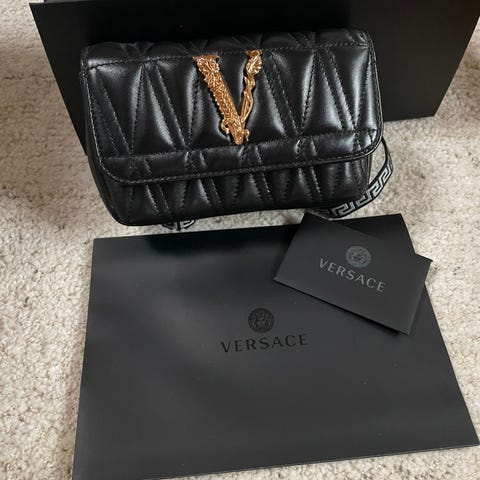 Lækker Skuldertaske, Versace schoulder quilted lamb + lam 21.. taske købt på outlet i udlandet - se billede for to små mærker. De var på den blev købt og er ikke forsøgt fjernet. Det er i bunden så det ses ikke.