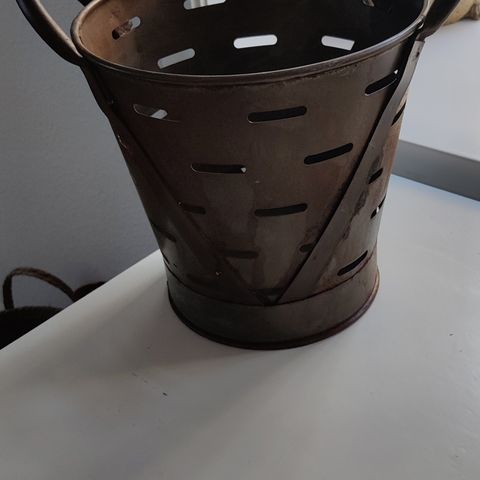 Gammel, rustik vinballonkurv i jern med patineret overflade. Kurven er lavet af kraftigt trådnet og er beregnet til at beskytte og bære en vinballon, men egner sig også fint som dekorativ opbevaring med et råt, industrielt udtryk.