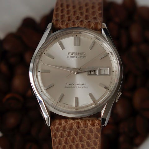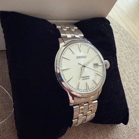 Uret er en sand homage til Seikos første mekaniske kronograf-armbåndsur fra 1964, med sin cremehvide skive, tovejs drejekrans og klassiske kassedesign.