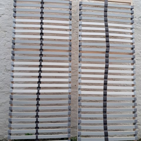 IKEA sengestel med tilhørende lamelbunde og monteringsdele. Sengen er lavet af træmaterialer og inkluderer nødvendige beslag til samling.