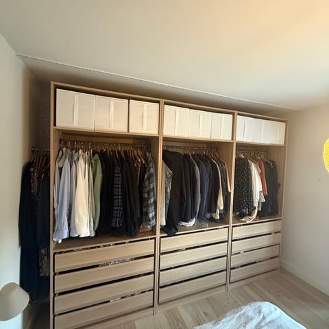 2 stk. IKEA PAX garderobekombination sælges. Brugt som walk-in skabe i soveværelse. I farven valnød (mørkebrun). Der er 8 skuffer i hver sektion. Derudover 3 stk. udtræk til fodtøj og 1 stk. udtræk til bælter. Det er selvfølgelig ikke nyt, men i fin stand. Fra 2021. Nypris pr. stk. ca. 9.000 kr. Sælges samlet for