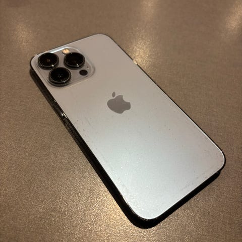 Apple iPhone 13 Pro smartphone med 128 GB lagerplads. Bagside ødelagt, men telefonen fungere fint.