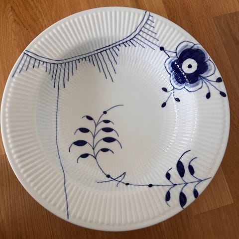 Royal Copenhagen Nax dyb tallerken/skål med håndmalet blå dekoration på hvid porcelæn. Tallerkenen har en rund form og er velegnet til servering af supper, gryderetter eller andre retter, der kræver en ekstra dybde