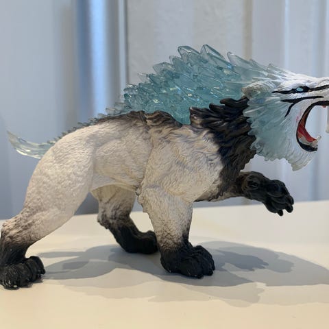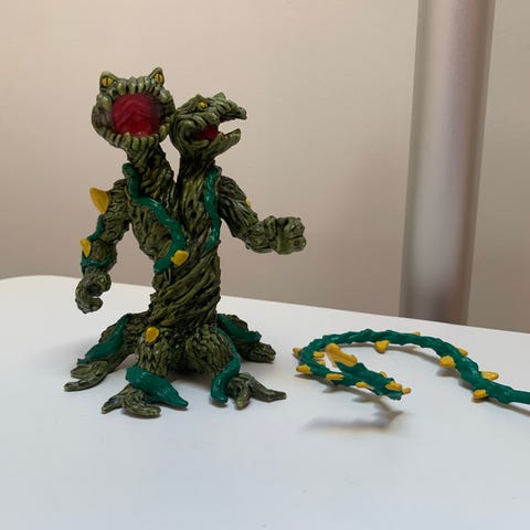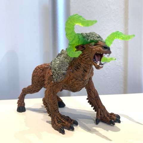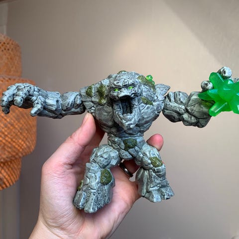 Det er en Schleich Eldrador Lava Golem med våben.