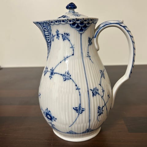 Flot og ubrugt Royal Copenhagen Musselmalet kande. 2. Sortering. Oprindeligt en kaffekande med låg men da dette er tabt, sælges den bare som kande.