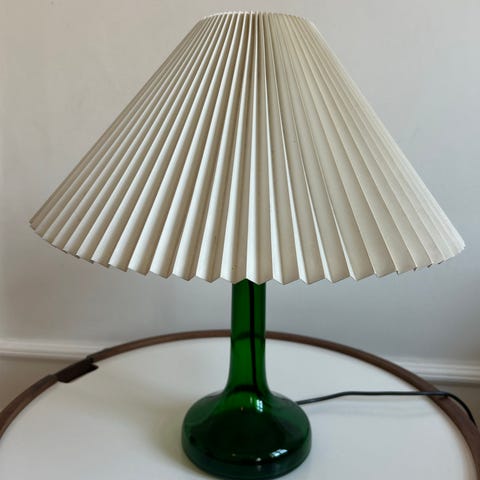 Fritz Hansen bordlampe designet af Arne Jacobsen. Lampen har en hvid, plisseret lampeskærm og en messingramme med sorte detaljer på håndtaget. Passer til brug som bordlampe i forskellige rum.