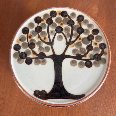 Kähler Keramik krus med et træmotiv i brun og beige farver. Kruset er lavet af keramik og har en fodet base. Det er fra Danmark og dateret 1999.