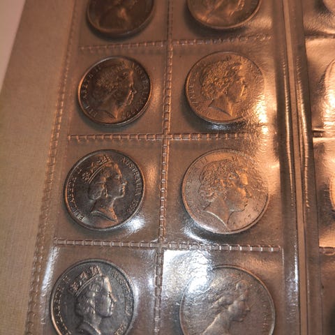 Samling af forskellige mønter i forskellige størrelser og designs. Mønterne er opbevaret i en gennemsigtig opbevaringsmappe med individuelle lommer til hver mønt.