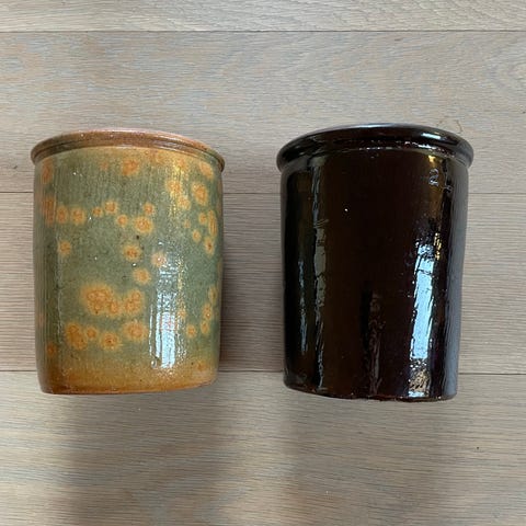 Sælger disse tre fine keramikkrukker med striber i blålige toner. De har masser af charme og patina og passer perfekt ind i en hyggelig, personlig indretning. Brug dem til planter, opbevaring, lys eller bare som pynt, i hjemmet eller sommerhuset.