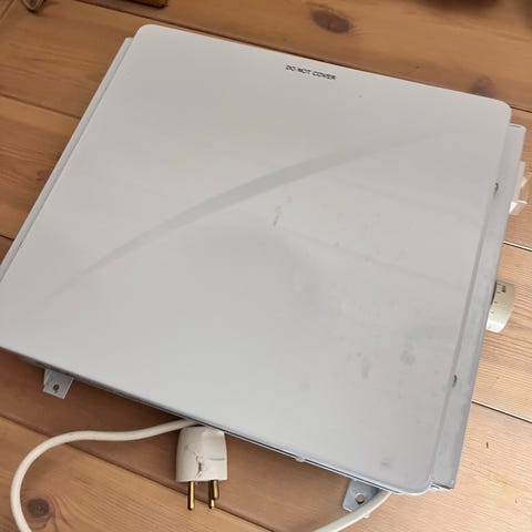 GRAD elektrisk varmeplade i hvid farve med kontrolpanel og strømstik. Enheden har IPX4 beskyttelse og er designet til opvarmning af rum. Produktet er udstyret med knapper til betjening og en digital skærm til visning af indstillinger.
