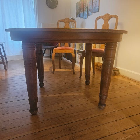 Bordet er slebet og behandlet med olie. Har en fugtskade på størrelse med bunden af et glas (se billeder). Splitten det ene ben sættes fast på er løs (men kan sættes fast) - det er uden betydning når bordet står, hvor det er helt stabilt, men kan gøre at benet løsnes når man flytter rundt på bordet.