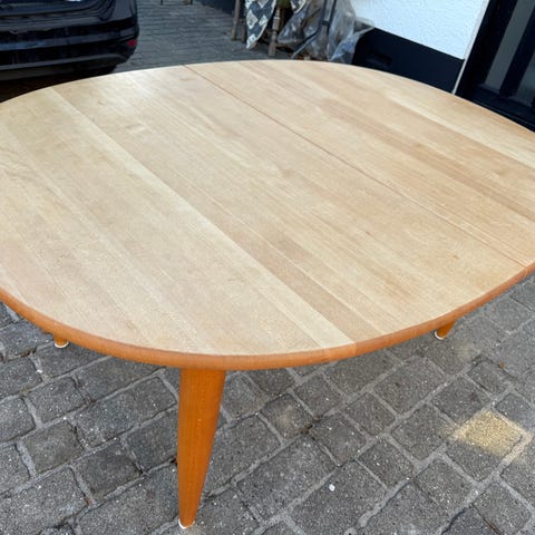 Fint ovalt bord der fint kan rumme 4-6 personer. Med 3 indlægsplader kan længden fordobles til større selskaber.
