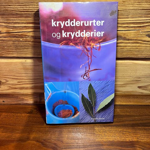 Bog med titlen 'Krydderier', indeholdende 39 opskrifter. Indeholder information om forskellige krydderier som anis og cayenne, herunder deres oprindelse, anvendelse og egenskaber.