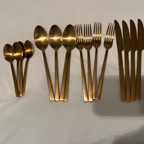 Almoco Flatwear guldbestik i mat guld med forventet brugsslidtage.