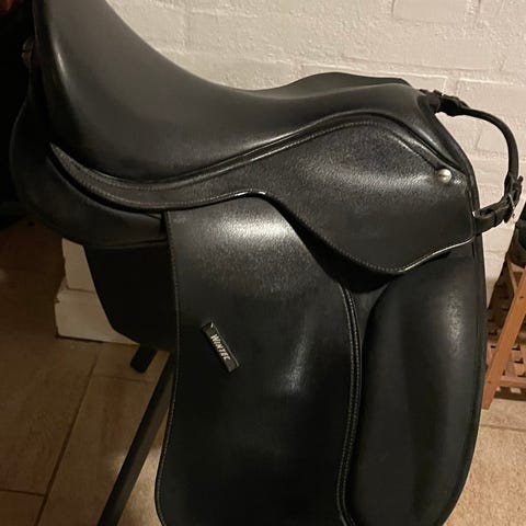 Dressur sadel næsten ikke brugt og ingen slid. Bummen kan skiftes efter bredden på ponyen eller kan ændres efter ponyens udvikling. Er i dag monteret med en bred bum.