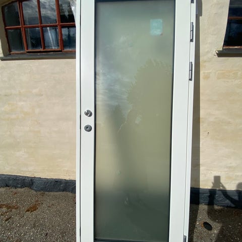 KPK Dør og Vinduer dør med målene 94,5x 263 cm i hvid farve. Døren er fremstillet til brug i byggeri og boligindretning. Ruderne er 2 lags termoruder alu og træ, sikkerhed glas. Fejlkøb.