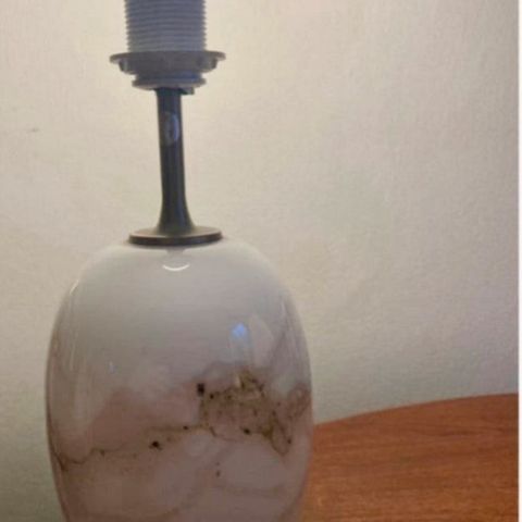 Holmegaard bordlampe i keramik med hvid farve. Lampen har en rund form med dekorative brune detaljer og er velegnet til brug som bordlampe i forskellige rum.