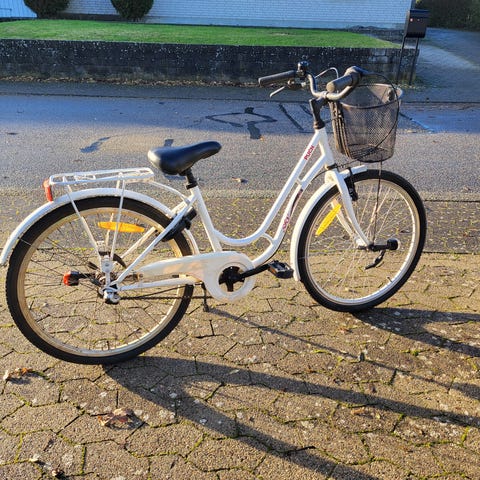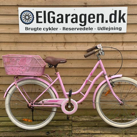 En pige cykel med 24 tommer hjul, turkis farve og med kurv. Cyklen har et stel designet til børn og håndtag med greb. Egnet til daglig brug og transport.
