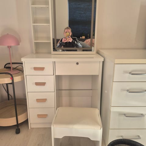 Enkelt og funktionelt makeupbord i hvid højglans der er nemt at tørre af.