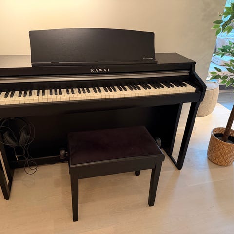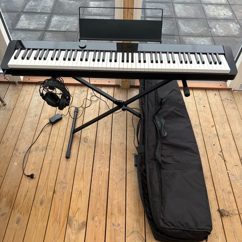 Casio Digitalpiano med sort finish. Digitalpianoet har et komplet tastatur med 88 tangenter og inkluderer et tilhørende stativ og bænk. Det er designet til at give en autentisk spilleoplevelse med digitale funktioner.