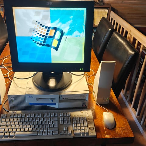 Retro computer fladskærm med tastatur og 2 højtaler.