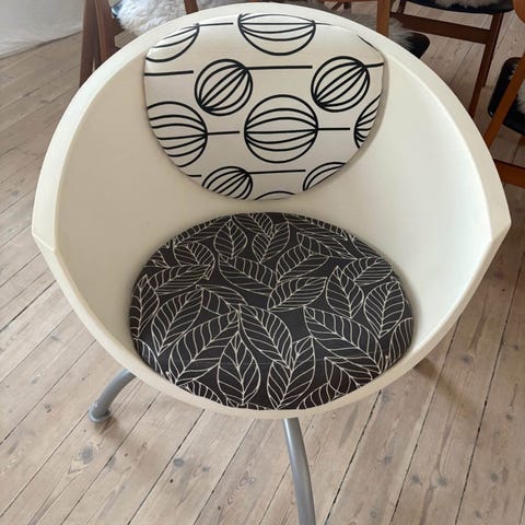 En pæn plast stol flot mønster god at sidde på.