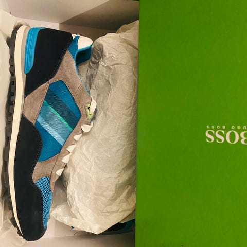 Hugo Boss sneakers i størrelse 44. Skoene har en sort farve med hvid sål. Designet til mænd.