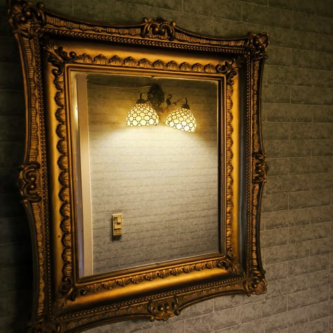 Ovalt spejl med guldramme udsmykket med blomstermotiver. Spejlet har en dekorativ ramme med detaljerede roser og er designet til ophængning på væggen.