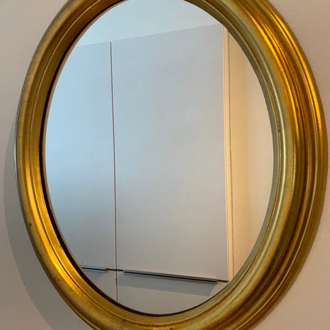 Ovalt spejl med guldramme udsmykket med blomstermotiver. Spejlet har en dekorativ ramme med detaljerede roser og er designet til ophængning på væggen. Mål 80 x 60 cm