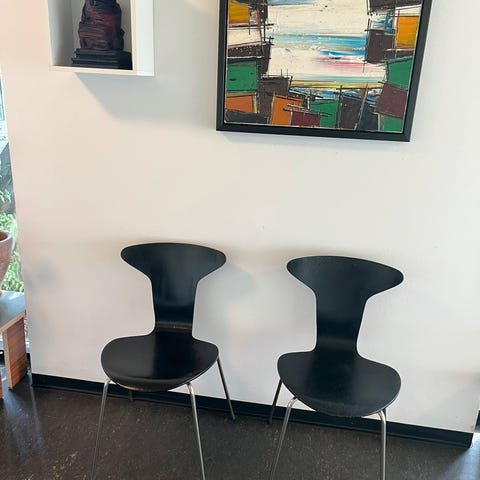 Fint originalt eksemplar af Myggen og kaldet Munkegårdsstolen. Munkegårdsstolen er fra 1955, og er den tredje i rækken af Arne Jacobsens originale skalstole. Stolen blev oprindeligt designet til Munkegårdsskolen, som stod færdigt i 1957. Denne stol skulle efter sigende have stået mange år på Rigshospitalet, men det kan ikke dokumenteres. Uanset står den helt original fra oprindeligelsen, som formentlig er slut 50'erne. Stolen har lidt skrammer hist og her, men står ellers flot og har aldrig været malet.