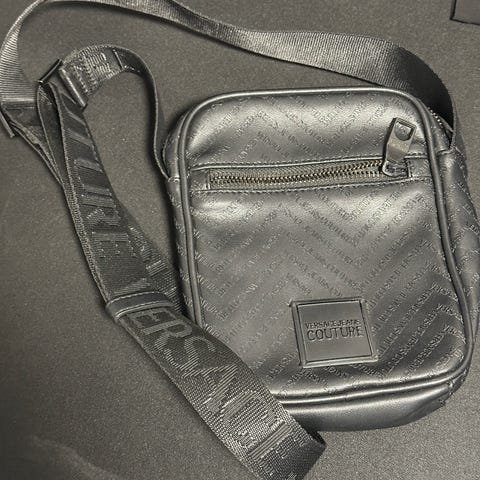 Versace kvindetaske i læder med sort og beige farve. Tasken har en skulderrem og et håndtag, flere rum og lukning med lås. Designet til kvinder, egnet til daglig brug og opbevaring af personlige ejendele.