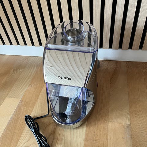 Slush Ice Maskine med farverigt design. Maskinen er egnet til fremstilling af slush ice og har en gennemsigtig beholder til indholdet. Den er udstyret med en elektrisk ledning til strømforsyning.