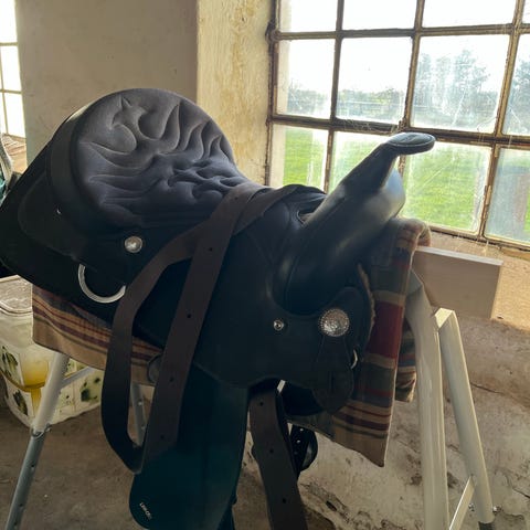 PS-Baum sadelsæt i læder med brune og sorte farver. Sættet inkluderer sadel og stigbøjler. Designet til ridning med fokus på holdbarhed og komfort.