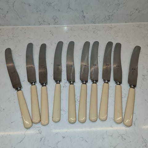 Knivene er i pæn stand med et godt skær i rustfrit stål med elfenbensfarvede skafter.