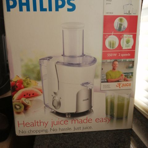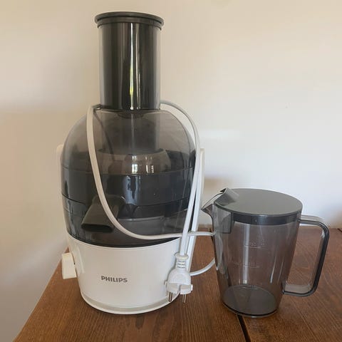 Philips juicer i sort farve med gennemsigtig beholder og sort opsamlingskop. Elektrisk med ledning til tilslutning.