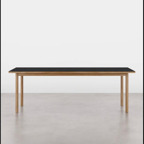 Bordpladen er beklædt med naturlig linoleum, som giver en smuk, mat finish og samtidig gør overfladen både vedligeholdelsesvenlig og støjsvag. Linoleum er et bæredygtigt materiale, der tilfører bordet et eksklusivt og naturligt udtryk.