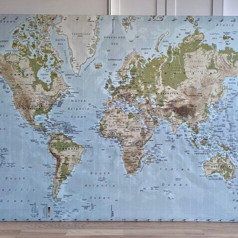 IKEA Verdenskort vægdekoration i neutrale farver. Kortet viser detaljerede geografiske oplysninger over hele verden. Velegnet til ophængning på væggen som dekorativt element.