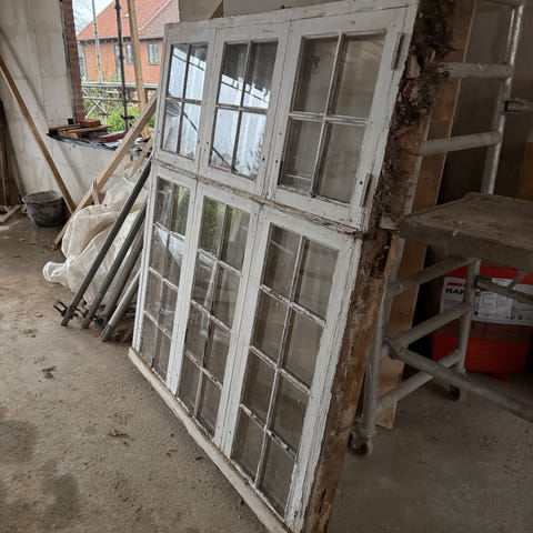 Vi har haft det som vindue i en skillevæg. Rustik og med patina. Der er ramme på.