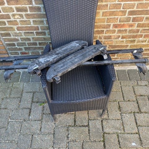 Brugt skiholder til tagbøjler. Kan indeholde 3-4 ski. Uden nøgle