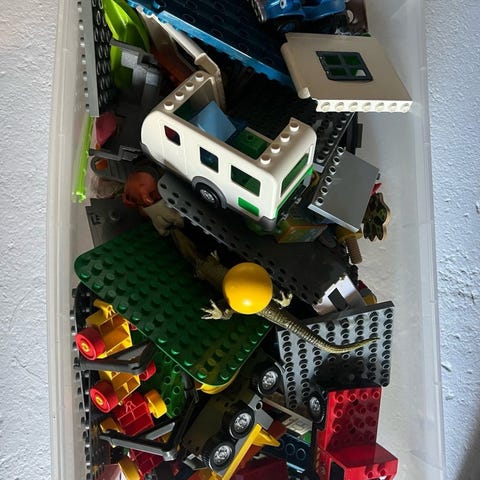 En kasse duplo Lego. Der indgår bl.a. en brandstation, zoologisk have mm. ikke sikkert at alle dele er der. Da jeg ikke lige har tålmodigheden at samle det😁. Ikea plastik kasse medfølger.