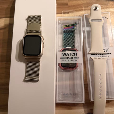 Apple watch SE3 med det nyeste chipset.Er som nyt,uden ridser har altid haft beskyttelse på, kun brugt en måned, kasse,kvittering haves der medfølger 3 armbånd med beskyttelses kasse