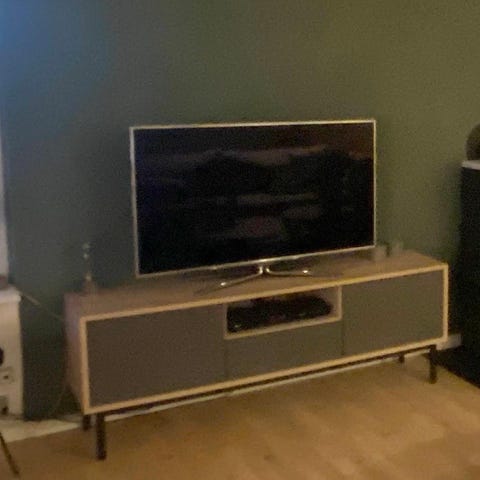 TV-Møbel, b: 180 d: 50 h: 64, Nypris: 10.000 kr., VOICE sort højglans TV-skænk med hvid glasplade, mærkevare, meget velholdt, Vejle Ø.