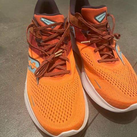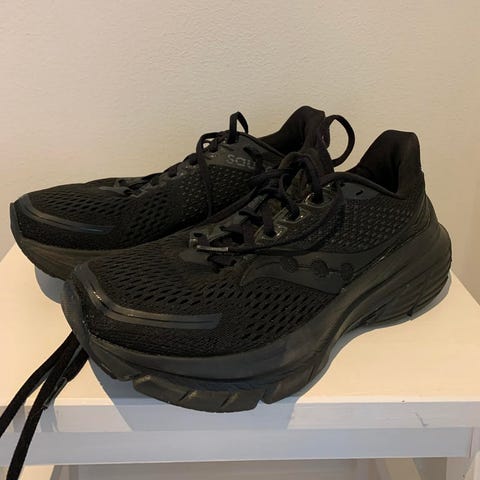 Saucony Guide 17 løbesko i størrelse 45. Skoene er sorte og designet til løb. Materialet og specifikke tekniske detaljer er ikke angivet. Skoene fremstår velholdte, dog hul i hælkappe, se fotos. Men stadig gode sko
