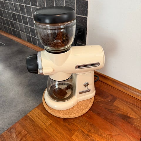 Kaffekværn, sort. Designet til at male kaffebønner til brygning. Udstyret med en beholder til bønner og en beholder til formalet kaffe. Strømforsyning via ledning. Justerbar kværn til forskellige formalingsgrader; espresso, filter, stempelkande.