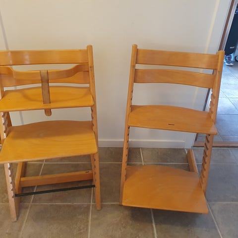 2 stk Stokke højstol i træ med justerbar fodstøtte og sæde. Designet til børn og kan tilpasses i højden for at støtte barnets vækst. Stolens materiale er træ med en mørk finish. 400/stk, begge 700,-