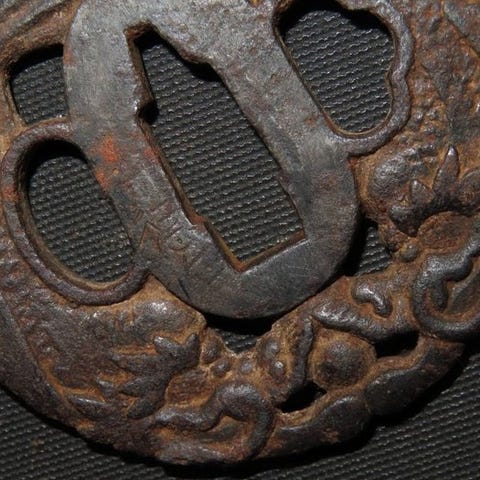 To styk jern Tsuba - Japan, Edo periode. 1) Maru Gata form, behandlet jern, udskåret, 8 cm x 8 cm x 0,4 cm og 2) Mokko Gata, jern udsmykket med blomster og insekt motiv, 7,5 cm x 7 cm x 0,4 cm.