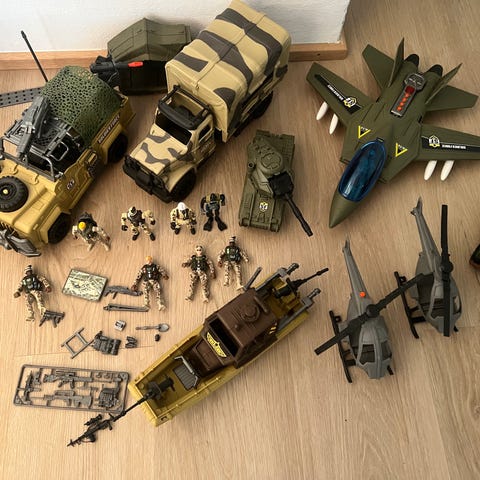Kæmpe sæt bestående af militær legetøj, inklusiv fly, helikopter, kampvogne, militære køretøjer samt flere soldaterfigurer og tilhørende våben. Materiale og mærke ikke angivet. Farverne er primært grøn, beige, sort og gul. Velegnet til leg med militærtema.