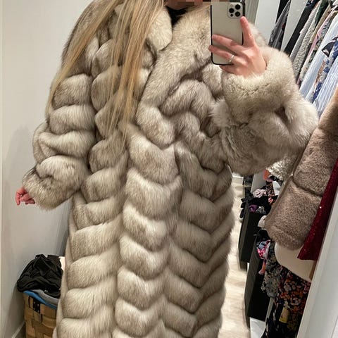 Meget flot pelsjakke i blå ræv fra Saga Fox. Passer s-m.