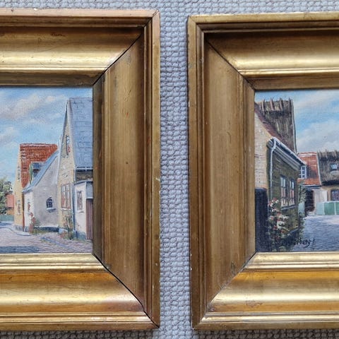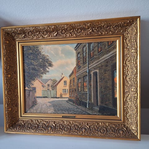 Maleri med motiv af Lybækstræde i Dragør. Indeholder detaljer af bygninger og træer under en blå himmel med skyer. Indrammet i en dekorativ, gylden ramme. Mål 30x40